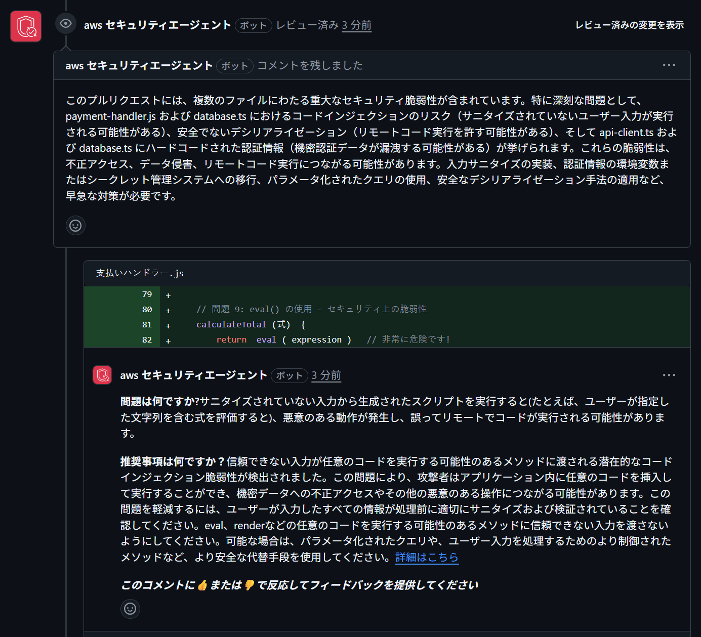 GitHub連携をしておけば、プルリクエストを作成するたびにSecurity Agentがコメントをしてくれる仕組みのようです。