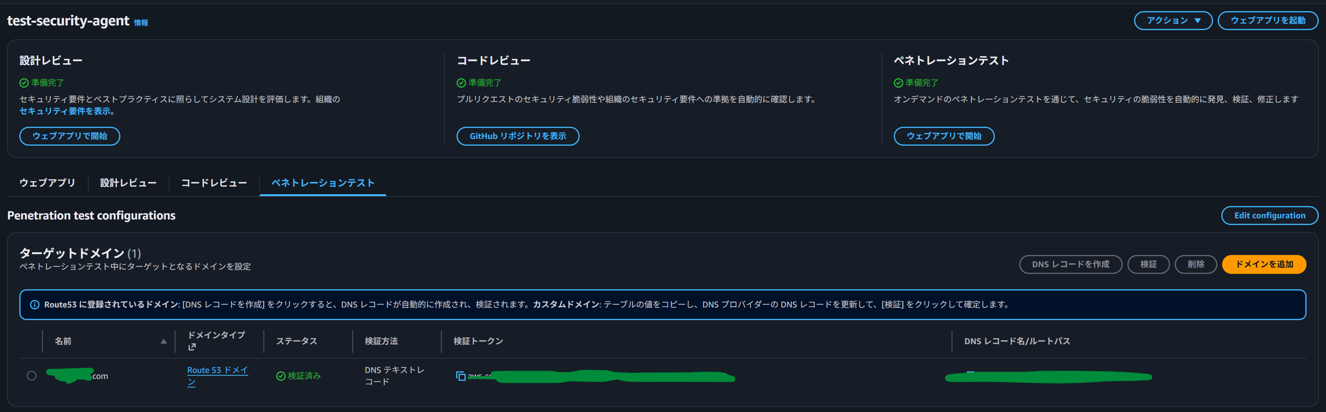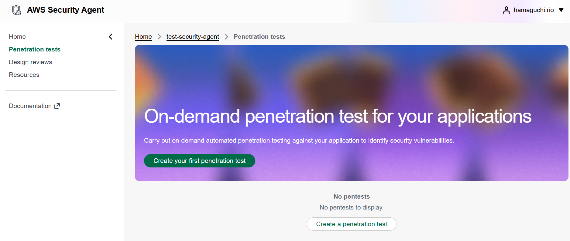 AWS Security Agentを開く。仕組みの説明を見ると、ペネトレーションテストアプリケーションの項目だけが「オンデマンド」と記載されています。ペネトレーションテストは利用者が必要なタイミングで手動実行する形式っぽいですね。