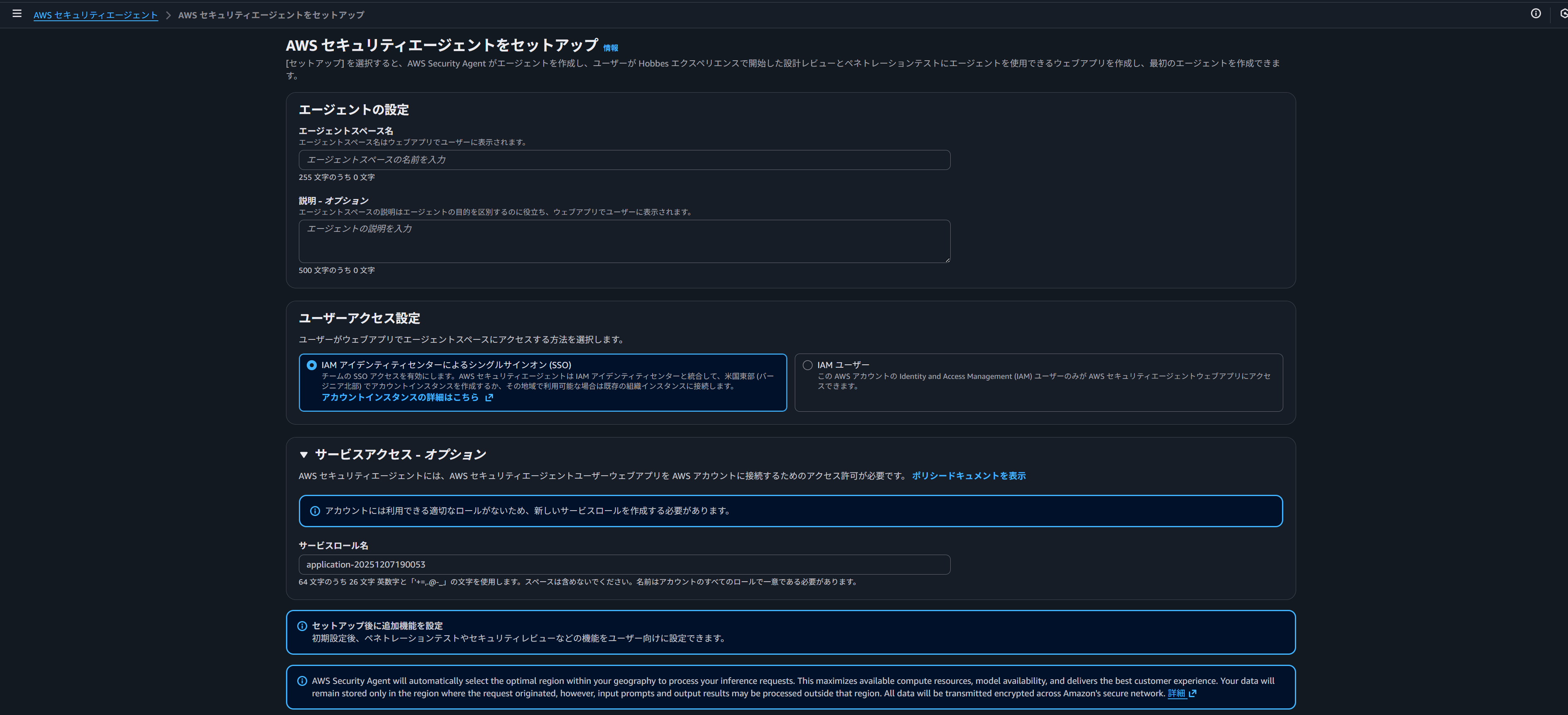 この画面では、エージェントスペース名の入力やアクセス方法の選択を行います。なお、アクセス方法で IAM ユーザーを選んだ場合、後から IAM Identity Center(SSO)方式へ切り替えることはできないため注意が必要です。