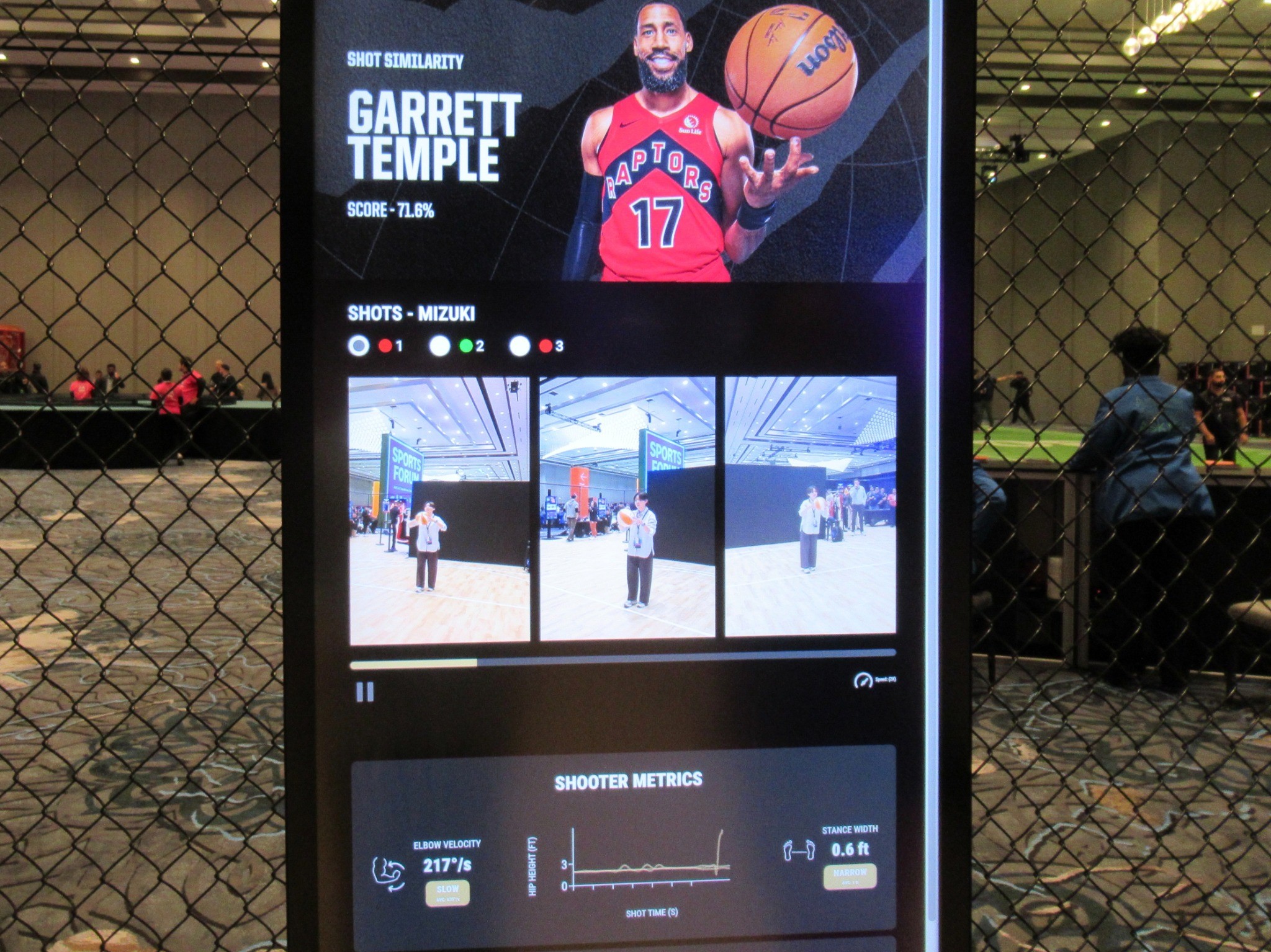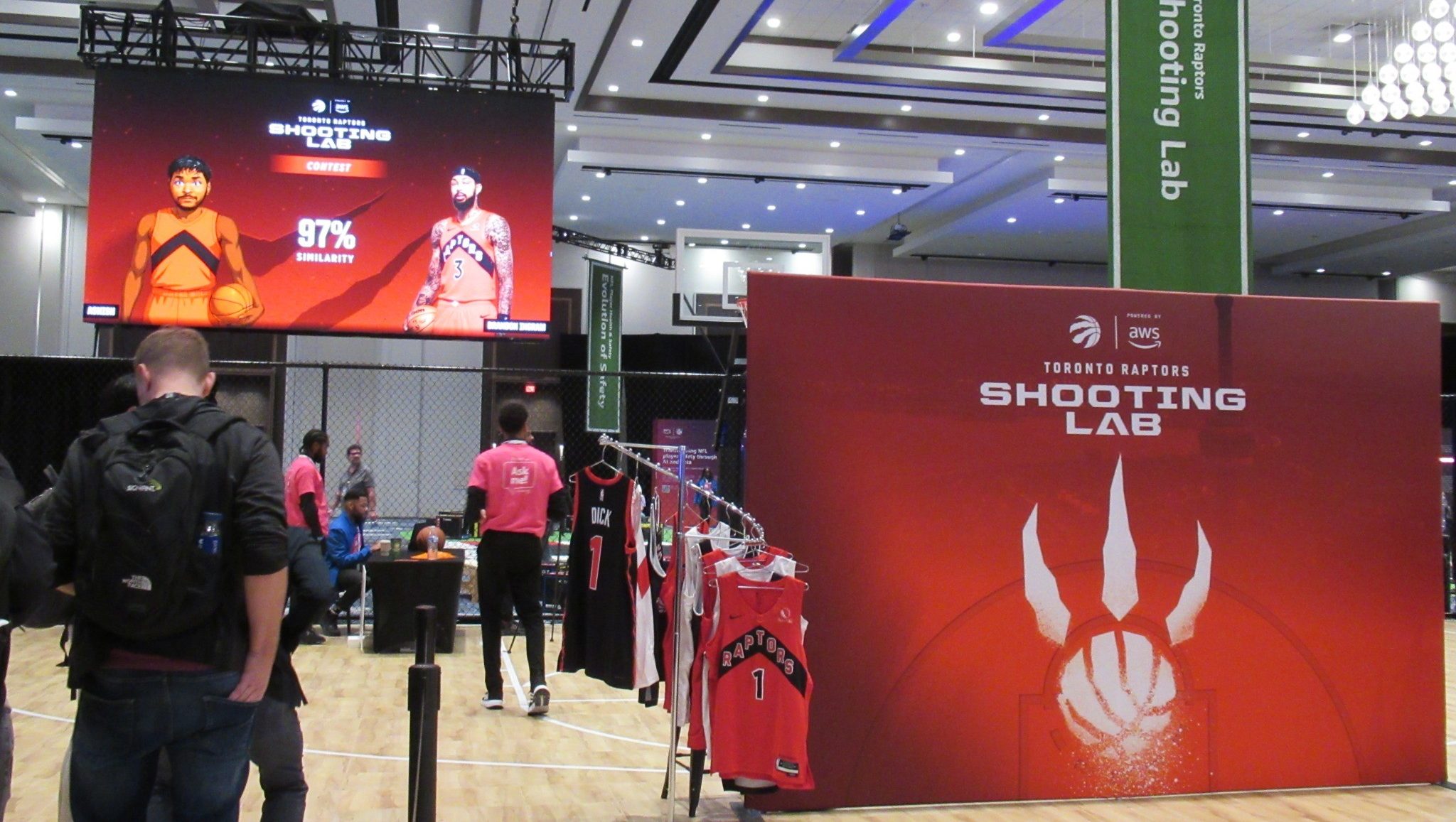 AWS × Toronto Raptors(MLSE)のデジタル・シューティング・ラボを実際に体験してきました!このブースでは、複数の高精度カメラとAIを使って、バスケットボールのシュートフォームをリアルタイムで解析する仕組みが紹介されていました。