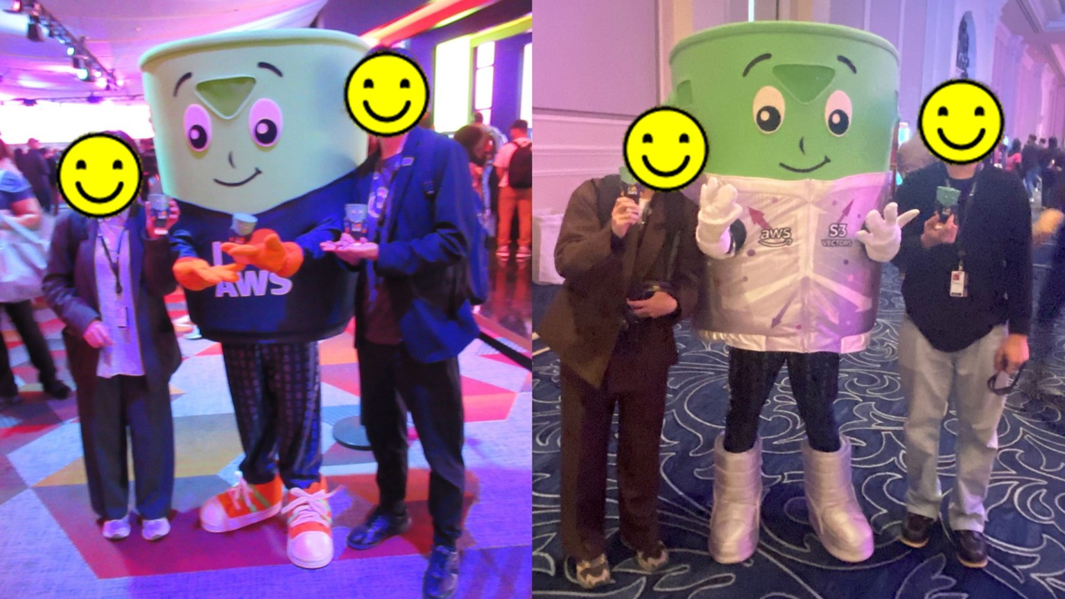 同じ S3 モチーフでも、日によってコスチュームが変わっていた のがとても面白く、「今日はどの S3 がいるんだろう?」と、会場を歩く楽しみが一つ増えました。単なる着ぐるみではなく、“バージョン違いで集めたくなる存在” として設計されているあたりが、さすが AWS だなと感じます。プロダクトの進化が、そのままキャラクターにも反映されているようで、技術イベントならではの“遊び心ある表現” がとても印象に残りました。