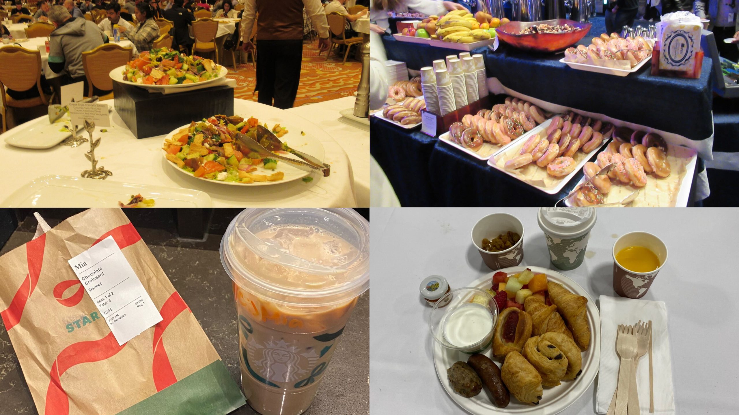 朝ご飯は9時まで、昼ご飯は13時まで用意されましたが、それ以外にも果物やドーナツなどの間食が用意されていたので食には困りませんでした。またThe Venetian内のスターバックスでは2つのドリンクと2つのフードまで無料!流石です…。
