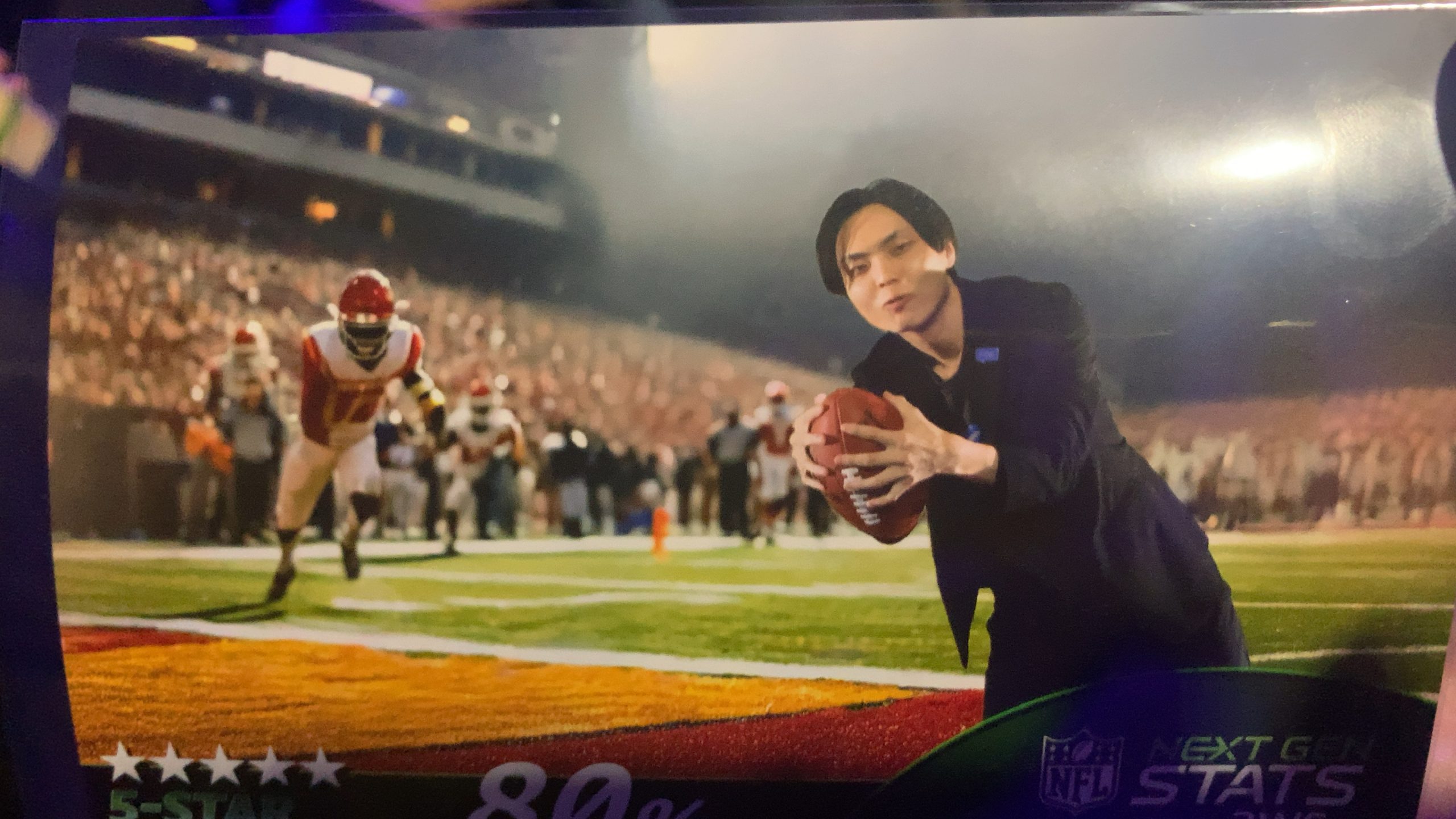 アメリカンフットボールのコーナーでは、ボールのキャッチシーンをカメラマンが撮影をしてくれます。その写真を瞬時にAI合成し、まるで自分が実際プレーしているかのような写真をもらえました。