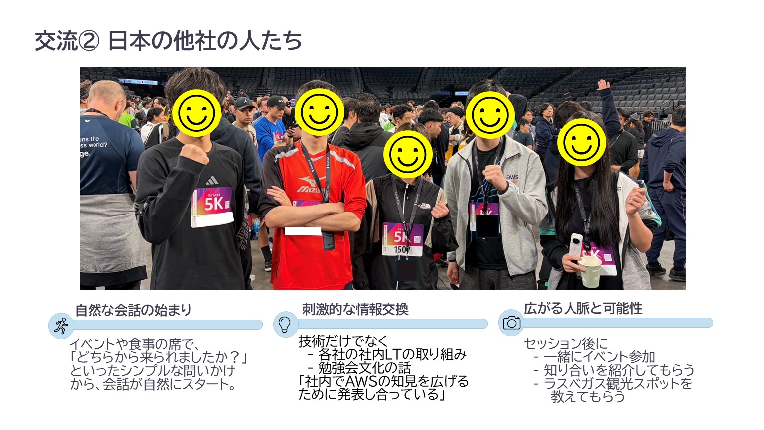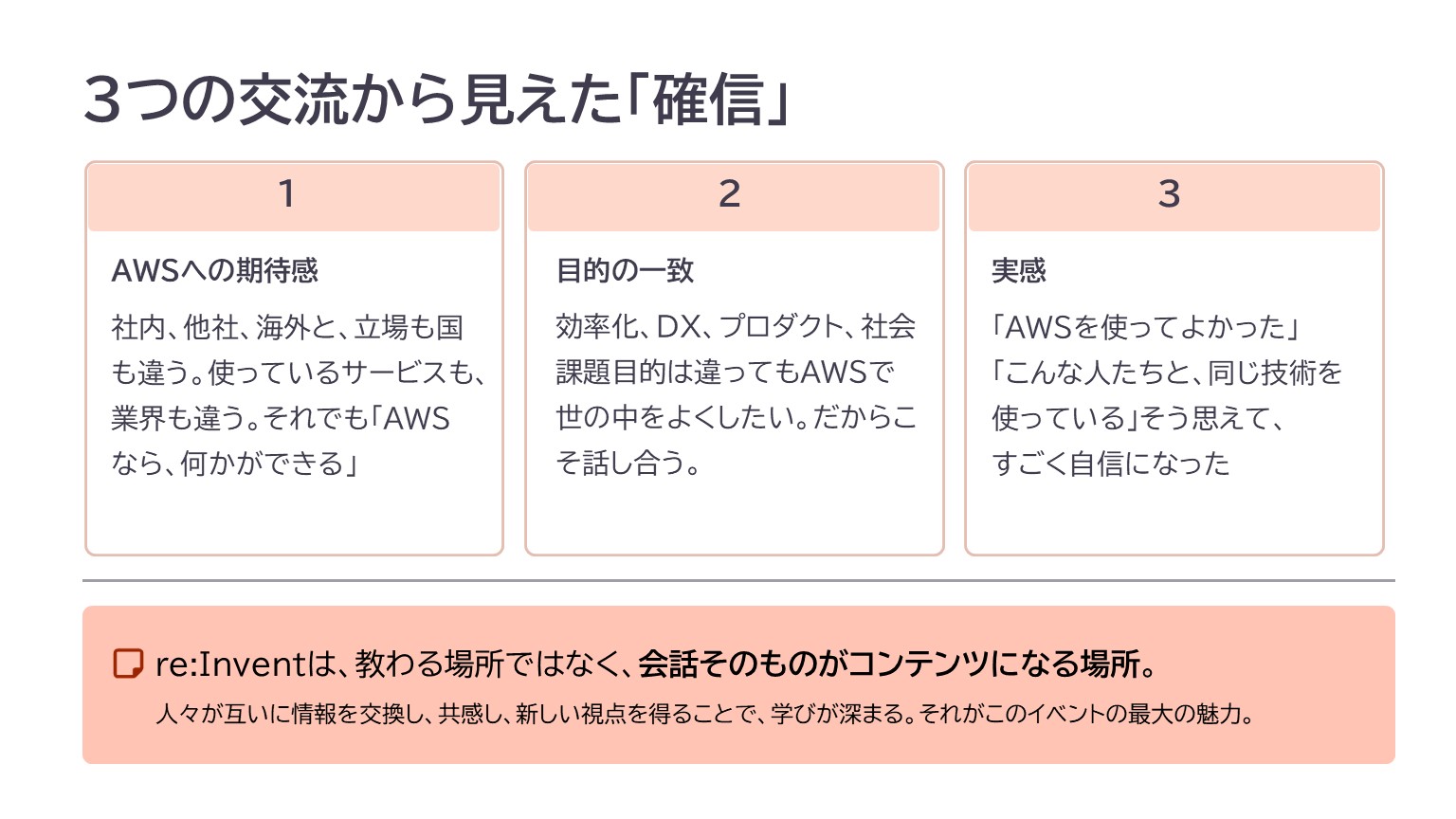 教わる場所というよりも、会話そのものがコンテンツになる場所。それが、現地で体感した re:Invent でした。