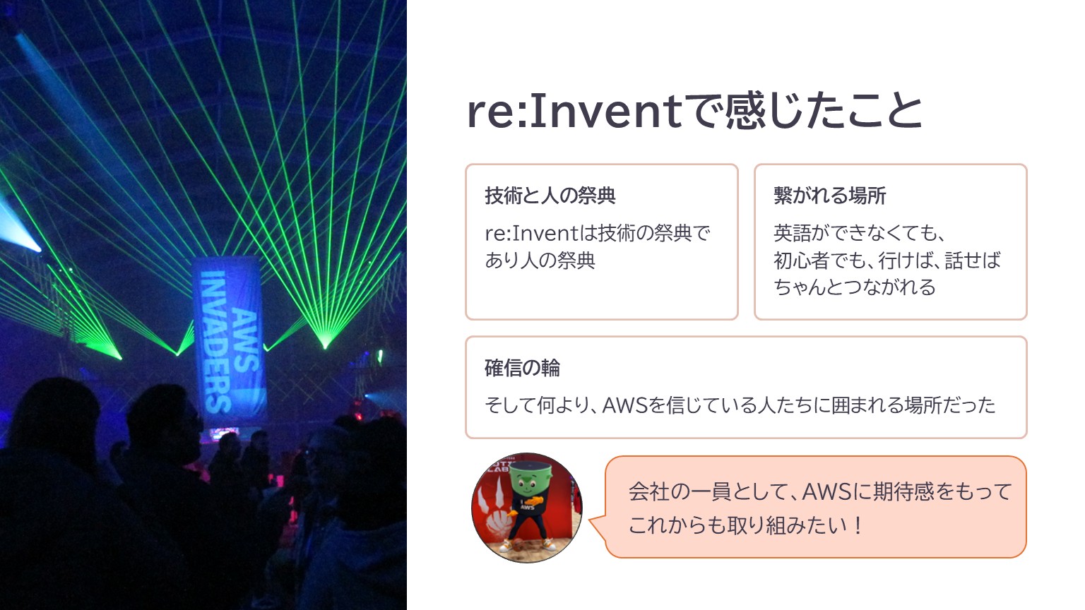 そして何より、AWSの可能性を本気で信じている人たちが、世界中にたくさんいるということを、肌で感じました。