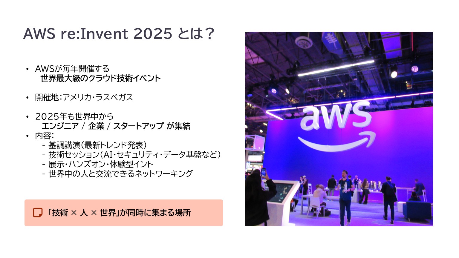 開催地はアメリカ・ラスベガス。世界中からエンジニア、企業、スタートアップが集まり、最新サービスの発表、セッション、ハンズオン、展示、交流イベントが同時多発的に行われます。