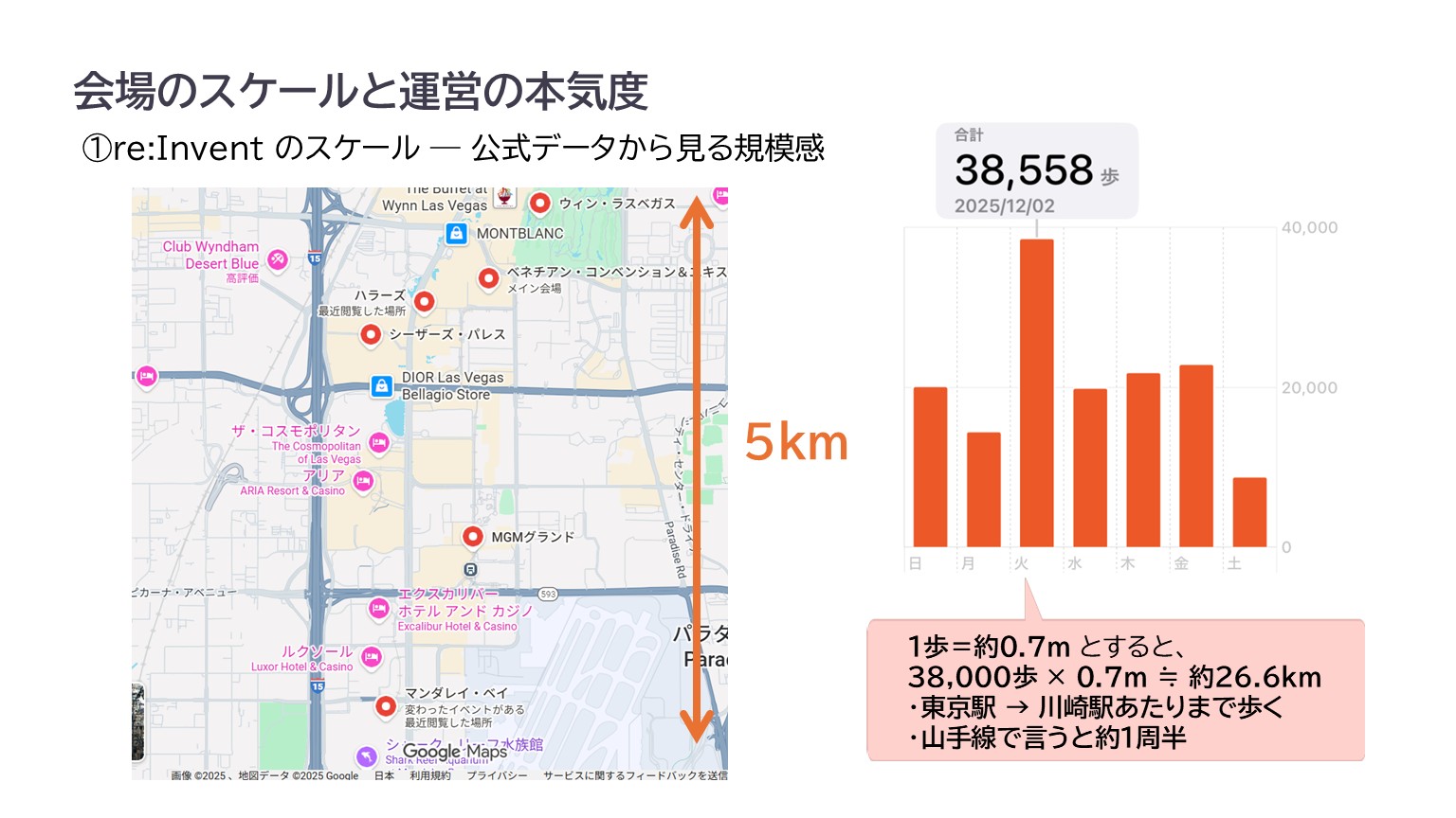 移動距離は南北でおよそ5km。私はハラーズに宿泊のしましたが隣のVenetian会場にたどり着くにも10~15分かかります。初日はWynn、Venetian、Caesars Forumを回ったのですが、歩数は38,558歩。距離にすると約26kmで、東京駅から川崎くらいまで歩いた計算です(笑)