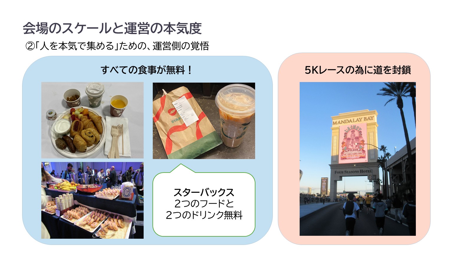 Las Vegasの町で食べるハンバーガーは日本円にして2000~4000円。円安を痛感させられる中、このフード無料制度により食への心配が消え、安心してイベントを楽しむことができました!「人を本気で集める」という覚悟を、街全体で感じる空間でした。