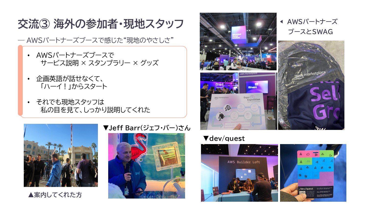帰国後、社内 LT 会で re:Invent の振り返りをするためにスライドを作っていたのですが、写真やメモを見返すたびに、現地での出来事や出会いが次々と思い出されました。