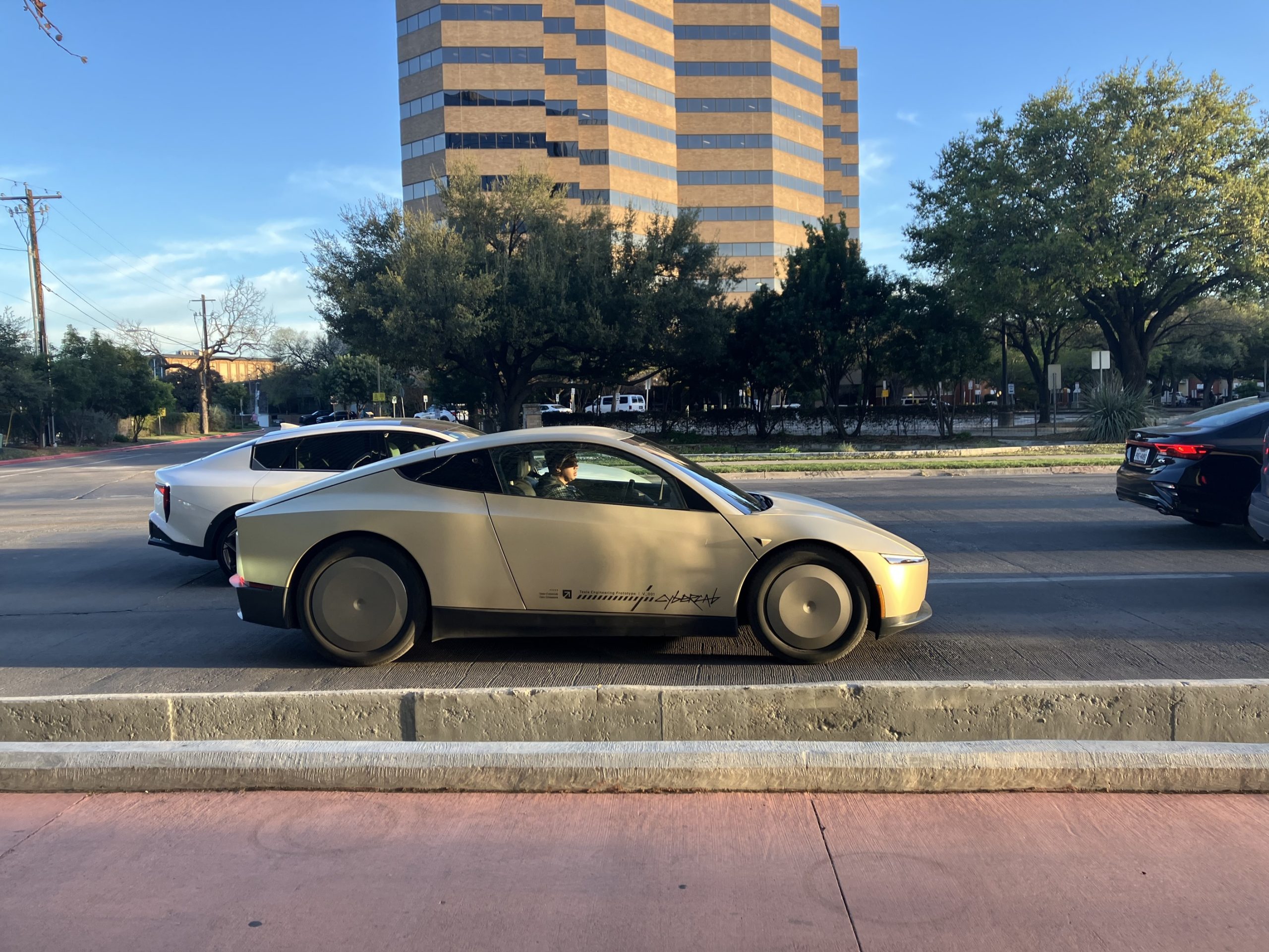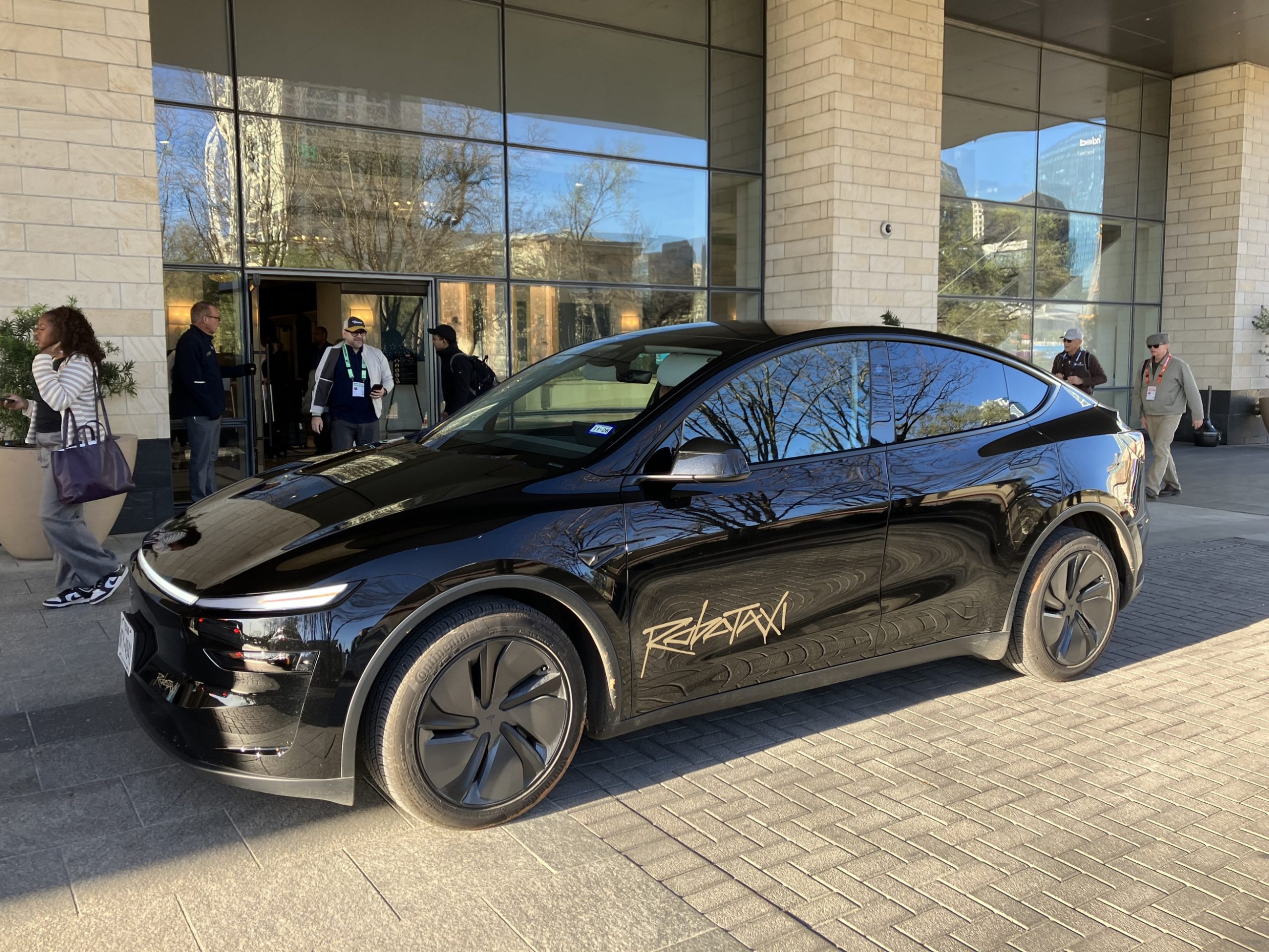 テスラのロボタクシー専用車「サイバーキャブ」は静態展示だけでなく、走行しているのにも遭遇しました。但し、公道においては必ずヒトが座っており、その前にはステアリングが付いているように見えました。