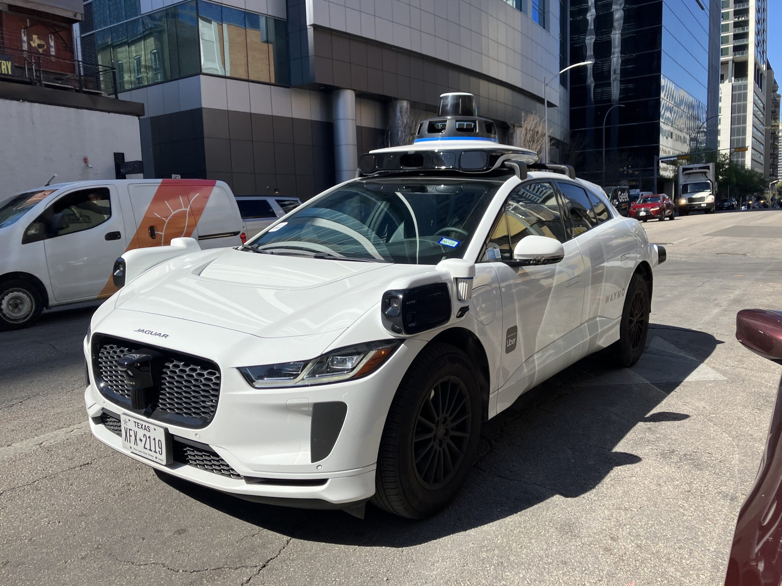 今回、宿泊したホテルと会場との間が7kmほど離れており、その往復はもっぱらロボタクシーを使用しました。LiDAR満載で走るウェイモ(ジャガーF-PACEベース)と、ビジョンだけで走るテスラRobotaxi(モデルYベース)です。いずれもまだフリーウェイは走れないようで、一般道(制限速度35マイル)を選んで片道20分のドライブですが、十分に実用的でした。運賃(という表現がそぐわない気もしますが)はいずれもダイナミックプライシングで、例えばウェイモが13ドルに対してテスラRobotaxiが9ドルなど、常にテスラRobotaxiの方が安かったです。主観的な評価ですが、ウェイモの運転は思い切りは良いが何となく怖い感じで、テスラRobotaxiの方が慎重で安心して乗っていられる感じがしました。