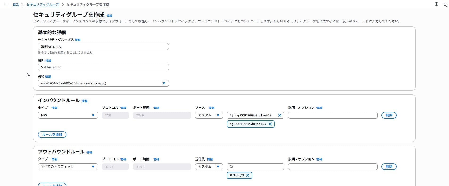 • インバウンドルールにタイプ:NFS、プロトコル:TCP、ポート:2049を追加し、先ほど作成したEC2のセキュリティグループからの通信を許可する