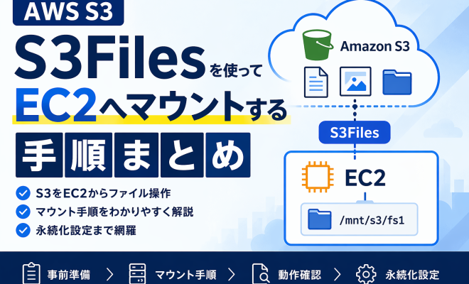 S3Filesを使うとEC2からS3を扱いやすくなります。 事前にセキュリティグループやマウントポイント、必要パッケージを整理しておくことで、導入をスムーズに進めやすくなります。 今回の流れをベースに、必要に応じて永続化や運用時の監視設定も追加していくとよいと思います。
